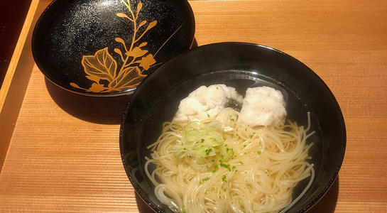 下ごしらを終えたハモを使って今夜の料理は「焼き霜造り」と「ハモ寿司」の一皿。「ハモ出汁に鰹出汁をあわせた、にゅうめん」、デザートには「水羊羹」となりました。