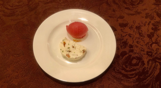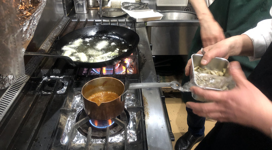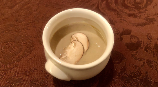 実食の料理メニューは「フォアグラのフラン マッシュルーム(シャンピニオン)のクリーム」「トランペット茸のポムパイヤッソン(じゃがいもの料理)」「ポルチーニのコンソメスープ」「キノコのソテー」「お口直しにヌガーグラッセ」。フレンチとは別に「松茸のスープ、昆布だしと洋風鶏だしをあわせて」も中村さんから。