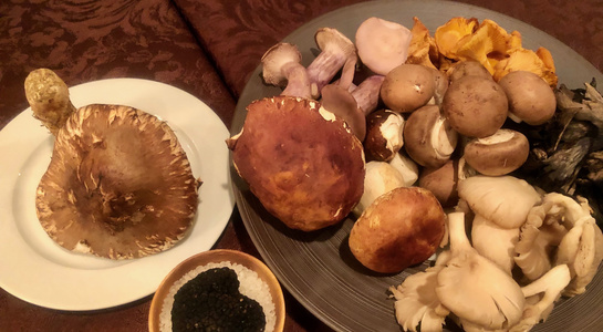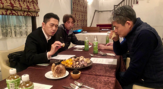 2019年最後の八頭会はエタンセールカワモトで「キノコ」をテーマに開催。ヨーロッパから取り寄せた「ジロール茸(アンズ茸)」「トランペット(黒ラッパ茸)」「プルロット(平茸)」「ピエ・ブルー(紫シメジ)」「ポルチーニ」、ほかはメンバーからの差し入れで「松茸」「黒トリュフ」も揃えて秋の味覚の勉強会がスタートしました。各キノコの特徴、価格、掃除のことなどを座学で勉強しつつ、日本の様々なキノコについての情報交換も。