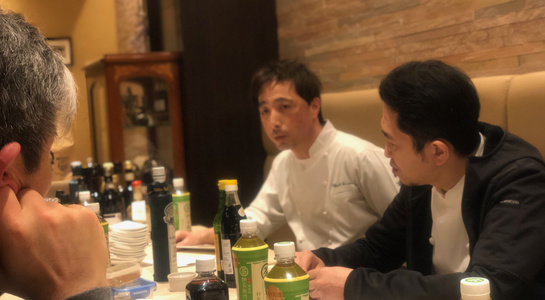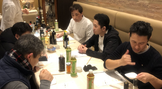 その後、フレンチや洋食で使うワインビネガーや、シェリービネガー、バルサミコ酢、シャンパンビネガーの試食をしながら使い分けの方法などを勉強。続いてビストロチャイニーズRONの入江シェフが中国の黒酢。寿司つばさの黄丹大将は京都の千鳥酢。江戸前鮨二鶴の船橋大将はオリジナル作っている酒粕から作った赤酢をもちより、各人で味を確かめながら使い方の違いなども情報交換しました。(油と混ぜて乳化させて使う西洋の酢と、そのまま使うため塩や砂糖をつかって味のカドを取る日本の酢の調理の話など。)